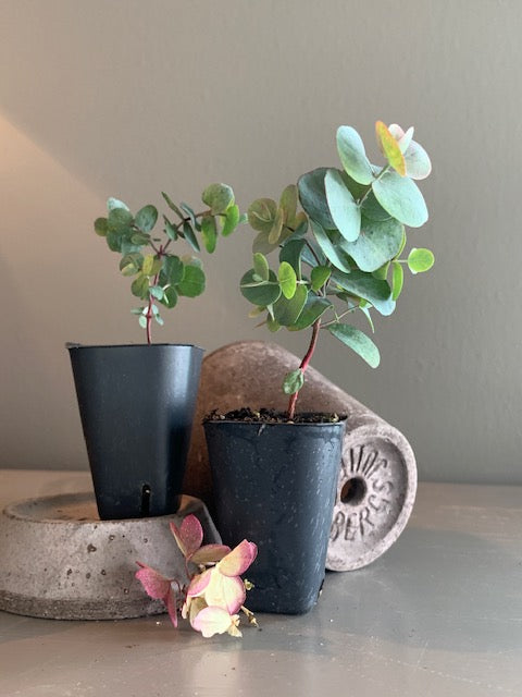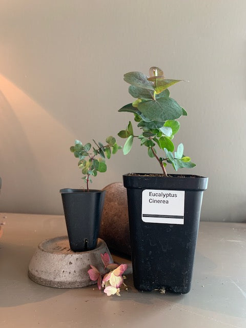 Cinerea Silver Dollar is like Baby Blue’s big brother. Larger leaves and more of a green-blue-silver color. Fast growing. Tender perennial in areas with no frost. Since EUC is not winter hardy, you'll be happy to know it can be grown in containers that can be brought indoors during winter and placed back outside when temperatures warm up in spring. When planting in the ground, black ground cover is recommended in areas with a short growing season.